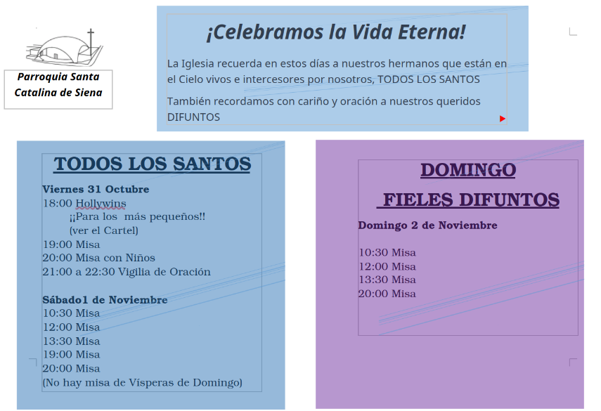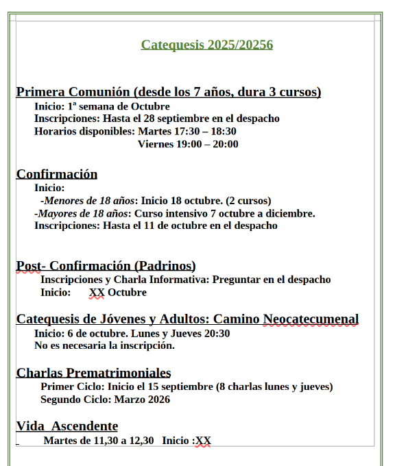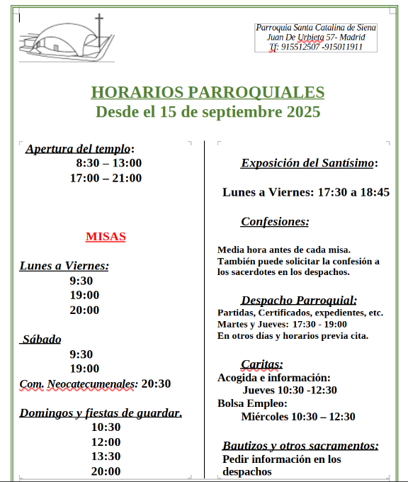 HORARIOS PARROQUIALES. Desde el 15 Septiembre 2025.